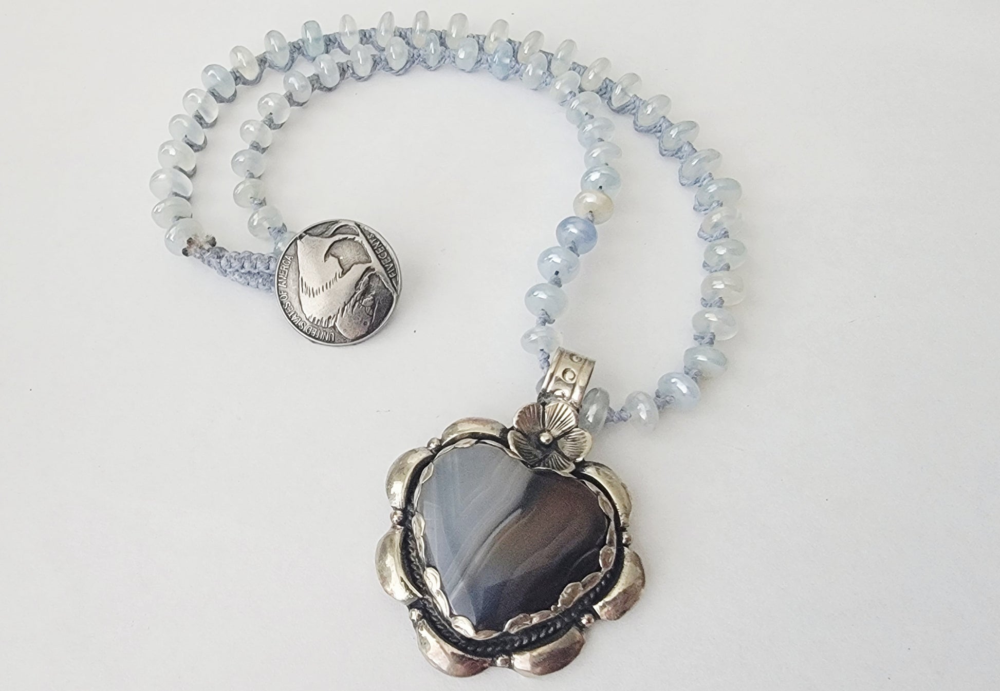 Blue Chalcedony Beaded Necklace with Hand-Carved Agate Heart Pendant