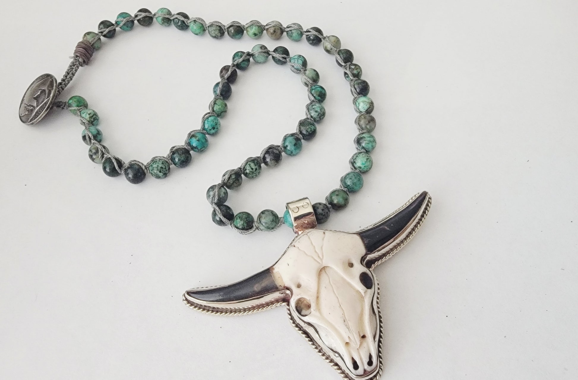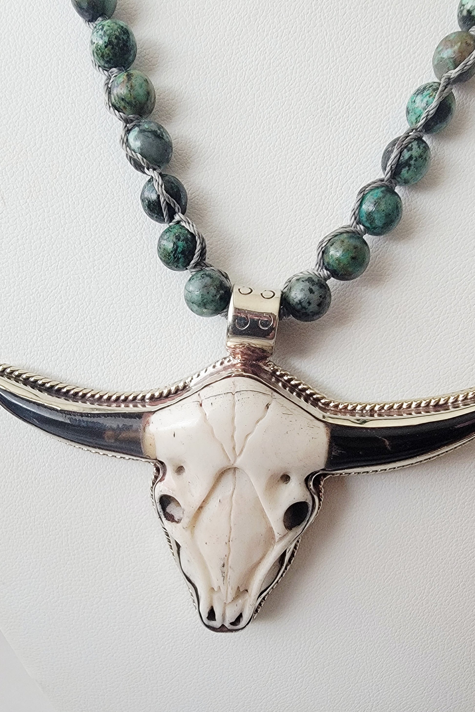 Make a bold statement with this handcrafted necklace featuring a striking longhorn skull pendant framed in silver detail. The pendant is suspended from a strand of natural turquoise-hued gemstone beads, each hand-knotted for strength and style. The earthy green and black tones of the beads perfectly complement the rustic, Southwestern feel of the pendant, creating a piece that embodies both edge and elegance.
